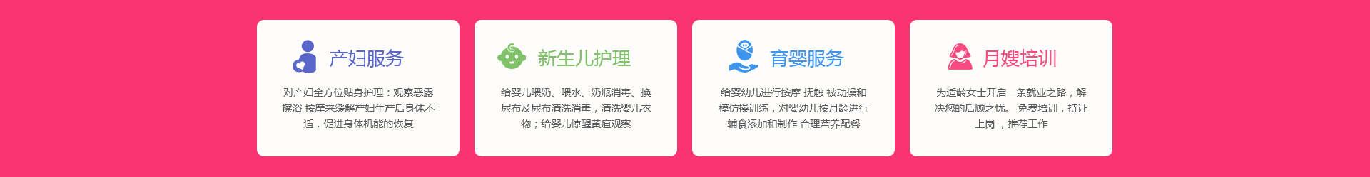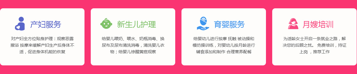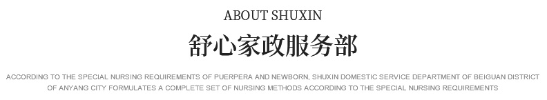 關于我們 產(chǎn)婦服務 新生兒護理 育嬰服務 月嫂培訓 催乳師培訓 舒心家政 月子餐 資質榮譽 服務案例